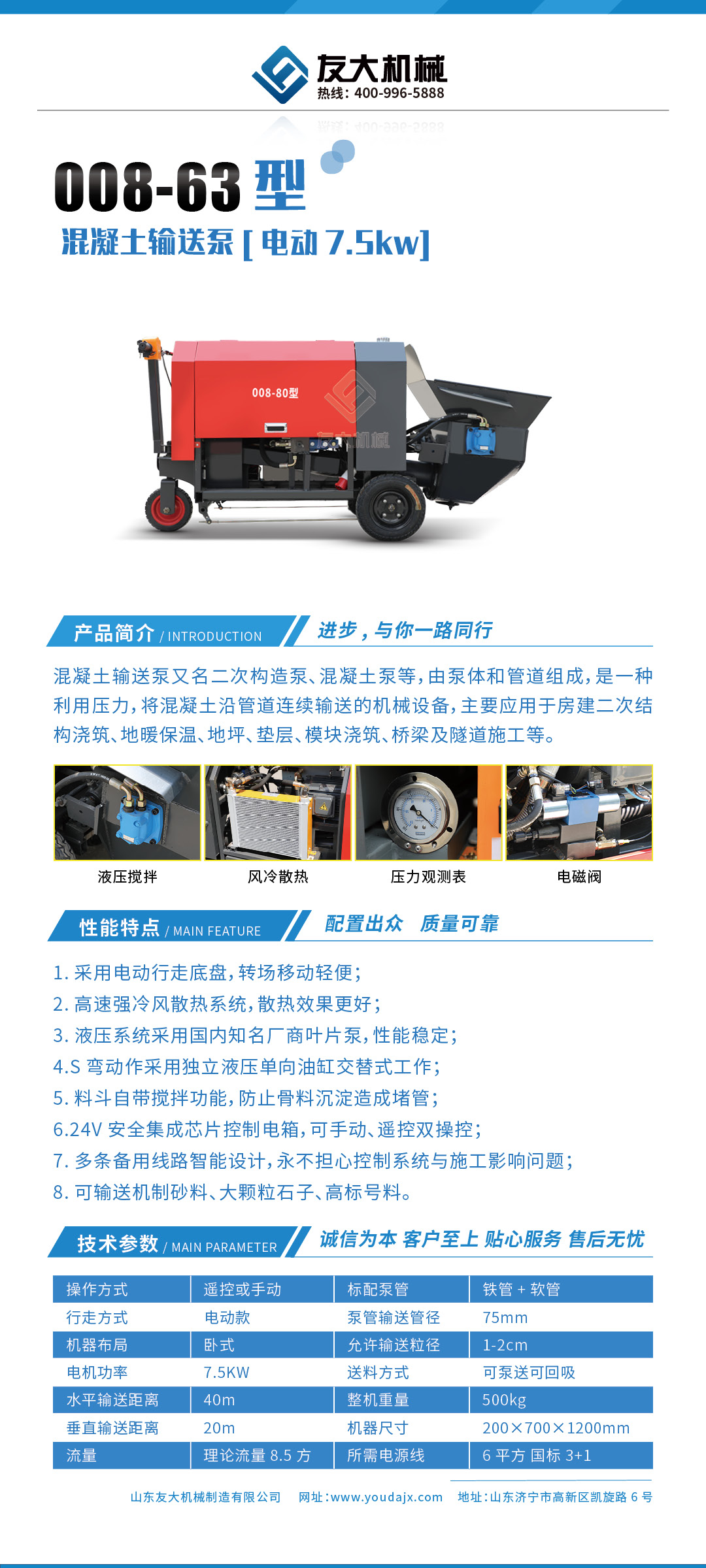 采用泵车尾轮驱动系统轻松解决移动时带来的各种困难,采用双排风冷散热系统散热效果更好,液压系统采用压力更高,性能更稳定的柱塞式自动变量主油泵,采用先进的三维立体压模一体式自动搅拌料斗可输送...